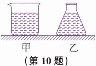 10. 如图所示,水平桌面上放着底面积相等、质量相同的甲、乙两容器,分别装有体积不同的同种液体且深度相同,两容器底部对桌面的压力分别是$F_{甲}$、$F_{乙}$,两容器底部所受液体压强分别是$p_{甲}$、$p_{乙}$,则(