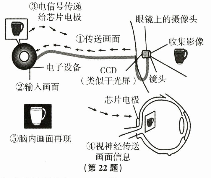 22. 近几年,人造眼球成像系统开始应用于临床试验,为失明患者带来福音。人造眼球成像系统主要由装有摄像头的眼镜、电子设备和芯片电极三部分组成,其工作原理如图所示。