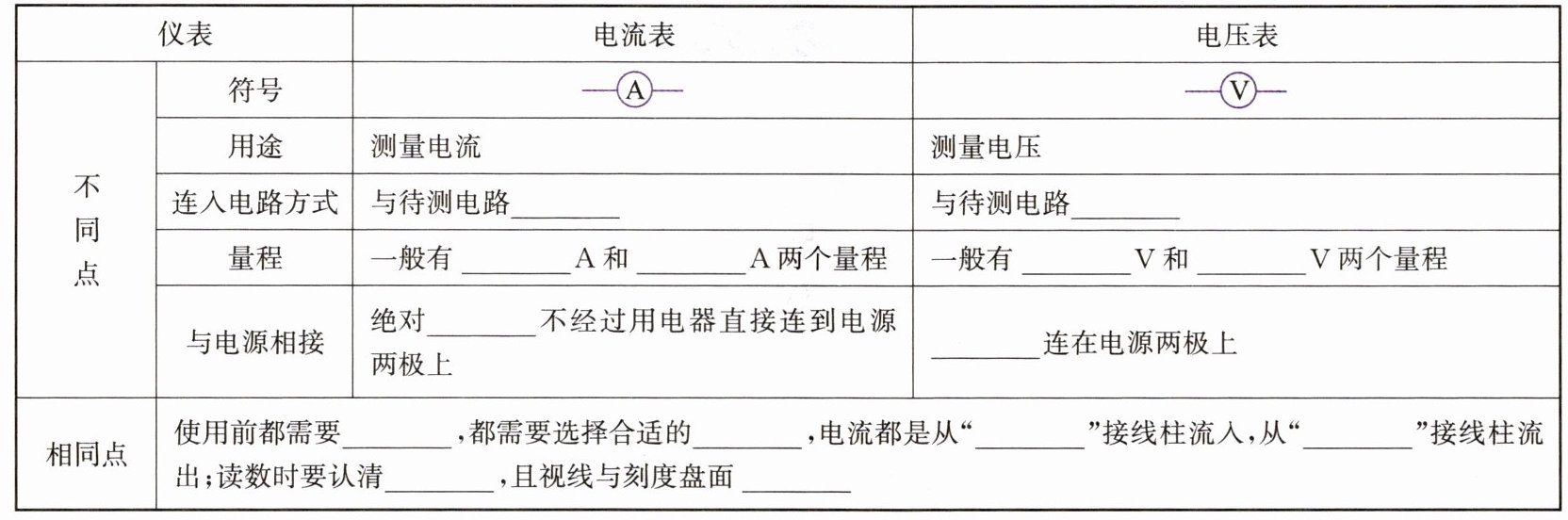 (3)$U_{总}=U_{1}=U_{2}$第四行:串联 并联 第五行:0~0.6 0~3 0~3 0~15 第六行:不能 能直接 第七行:调零 量程 + - 分度值 垂直