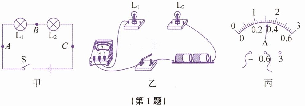 (2) 连接实物电路时,开关应处于____状态。第1次实验时,小明依次测量$A$、$B和C$三处的电流,并记录在题表中,$C$处的电流表示数如图丙所示,为____$A$。