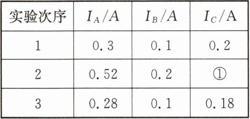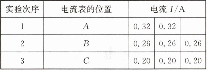 状态。连接好实物电路后,用电流表分别测出$A$、$B$、$C三点的电流I_{A}$、$I_{B}$、$I_{C}$将实验数据记录到表格,表中①处的电流(如图乙所示)为0.32