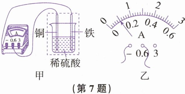 7. 如图甲所示,将铁片和铜片插入稀硫酸中,电流表的指针会发生偏转,若此时指针的位置如图乙所示,则电流的大小为