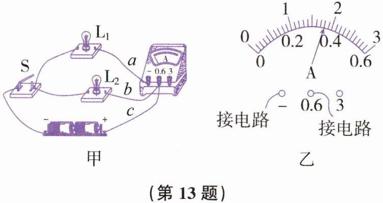 13. 如图甲所示为用电流表测量电流的实物连接图。