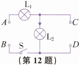 12. 根据如图所示的电路图中标出的电流方向,在图中的AB和CD间分别画上一节电池或一只电流表的符号。要求:①使电路中实际的电流方向和图中所标出的方向一致;②符合电流表的使用要求。