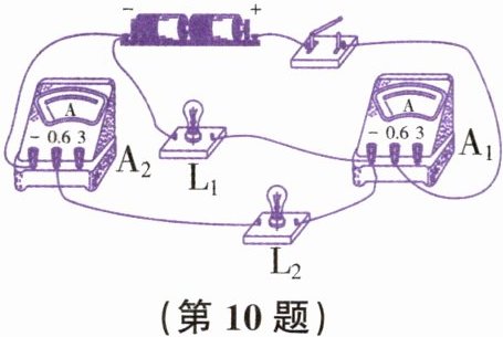 10. 某电路如图所示,闭合开关,电流表$A_{1}$的示数为0.5A,$A_{2}$的示数为0.22A。下列分析中,正确的是(