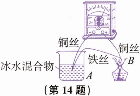 14. 用两种不同材料的金属丝(铁丝和铜丝)组成如图所示的闭合电路,使AB两端存在温度差,电路中就会有电流通过,这种电路叫热电偶电路。实验表明,热电偶电路中电流的大小跟相互连接的两种金属丝的材料有关,且接点A和B间的温度差越大,电流越大。