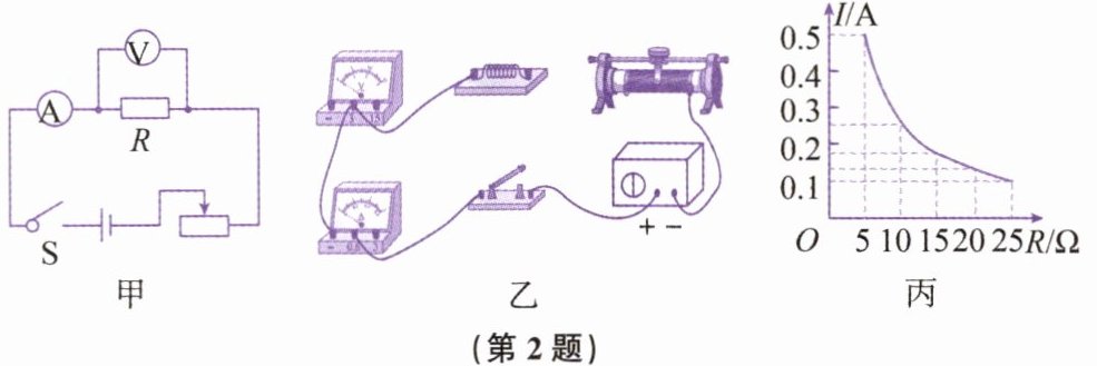 2. 小明利用如图甲所示的电路探究电流跟电阻的关系。已知电源电压为6V且保持不变,实验用到的电阻阻值分别为5Ω、10Ω、15Ω、20Ω、25Ω。