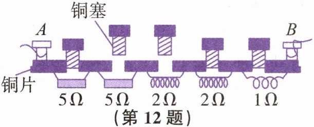 12. 实验室有一种拔插式变阻器,其结构如图所示,六个铜片依次排开,每相邻两个铜片间有不同阻值的定值电阻或电阻丝相连接,五个铜塞均可在相邻两铜片间的空隙处自由插入或拔出,从而改变A、B间的电阻值。