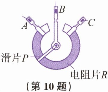 10. 如图所示为串联在某台灯中用于调节亮度的电位器的结构图,A、B、C是它的是三个接线柱,A、C分别与弧形电阻丝的两端相连,B与金属滑片P相连,转动旋钮,让滑片P在弧形电阻丝上滑动即可调节灯泡亮度,下列分析中,正确的是(