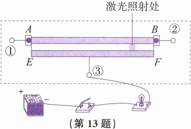 13. 如图所示,虚线框内是光敏变阻器的结构图,AB为阻值均匀的薄膜电阻,EF为一条导电电极(相当于导线),在AB、EF之间是光导电层(无激光照射时为绝缘体,有激光照射时被照射处的光导电层导电,在该点处将薄膜电阻和导电电极接通),①、②、③为接线柱。