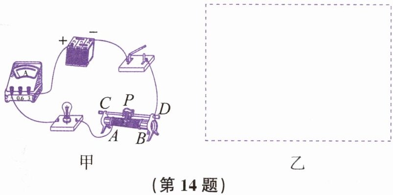 14. 在“用滑动变阻器改变灯泡亮度”的实验中,同学们连接了如图甲所示的电路。