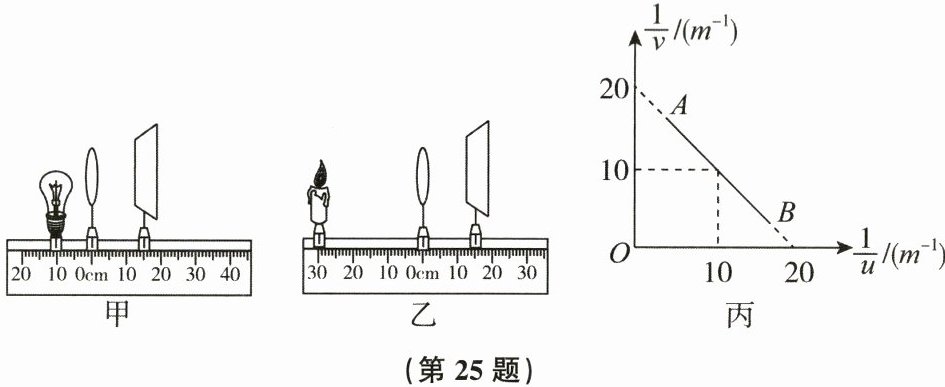 (4)如图丙所示,线段AB为用另一个凸透镜多次成像时测得的物距的倒数和像距的倒数所描绘出的图像,则该凸透镜焦距为