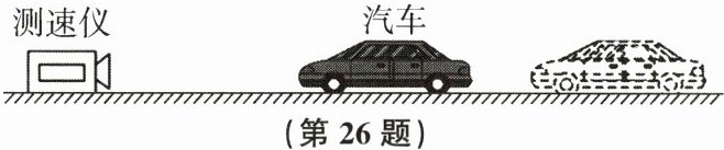 26. 测速仪在测试用路段上对某汽车进行测速时,向匀速驶来的汽车发射两次超声波信号,两次发射超声波信号的时间间隔是1.0s,第一次发射信号到接收用时0.6s,第二次发射信号到接收用时0.3s(超声波速度取340m/s)。