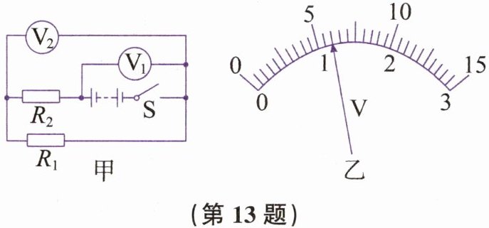 13. 在如图甲所示的电路中,当闭合开关后,两个电压表指针偏转均如图乙所示,则电压表$V_{2}$测的是