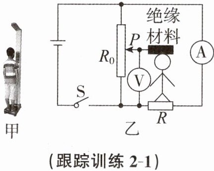 跟踪训练2-1 (2024秋·金华市东阳市期末)如图甲所示的仪器是身高、体重测量仪,当体检者站在台面上时能自动显示身高和体重,其电路原理如图乙所示,$R_{0}$为定值电阻,电压表、电流表分别显示身高和体重的大小,力敏电阻R的阻值随压力增大而减小,滑片P随身高的增高而上滑。下列分析中,正确的是 (