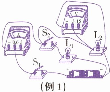 例1 (2024秋·杭州市滨江区期末)小温用两个小灯泡、电表和一些其他器材连成了如图所示的电路。若电源电压恒定,先闭合开关$S_{1}$,再闭合开关$S_{2}$,两表示数变化应是 (