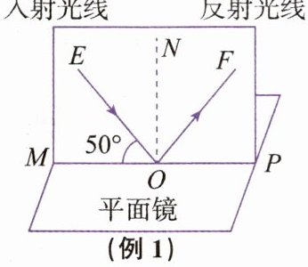 【例1】小王在家里将一个平面镜放在水平桌面上,再把一张可沿ON折叠的硬白纸板ENF竖直地立在平面镜上,以此来探究光的反射定律。通过测量他发现此时入射光线与平面镜成50°夹角,如图所示,则 (