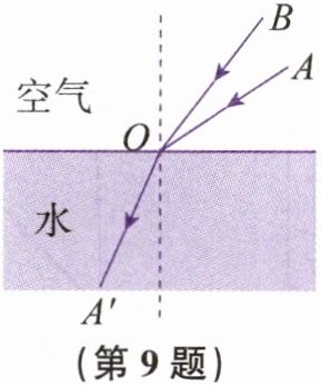 9. 如图所示,$OA'$是入射光线AO的折射光线,请在图中画出入射光线BO的反射光线和该入射光线在水中的折射光线的大致方向。