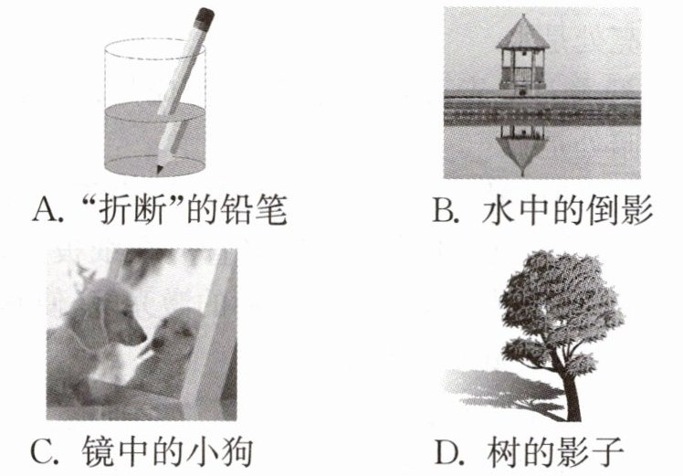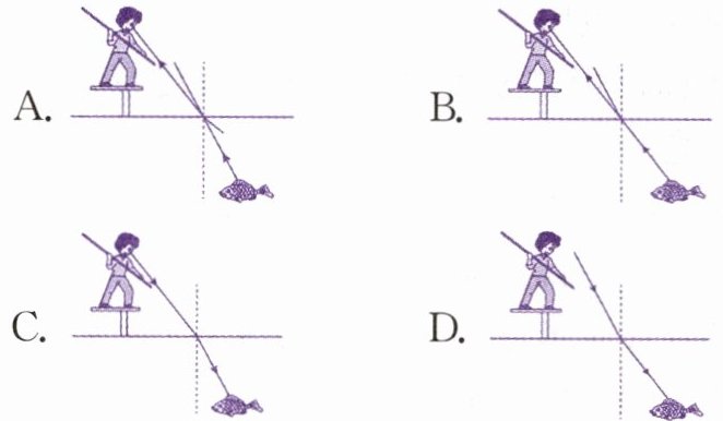 8. 渔民使用钢叉捕鱼时,钢叉要对准看到的“鱼”的下方叉,因为实际的鱼在看到的“鱼”的下方。下列选项中,能正确反映渔民看到“鱼”的光路图是 (
