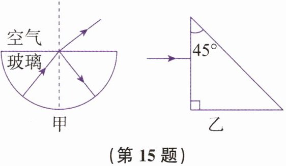 15. 小文发现了一种特殊的现象——光的全反射,并对该现象进行了演示:将一束光从某种玻璃中射向空气(如图甲所示),保持光线与玻璃的平直面的交点不变,改变入射角(每次增加$0.2^{\circ }$),当入射角等于某个特定的角度时,折射光线消失,只存在入射光线与反射光线,这种现象叫作光的全反射,发生这种现象时的入射角叫作这种物质的临界角。当入射角大于等于临界角时,只发生反射,不发生折射。