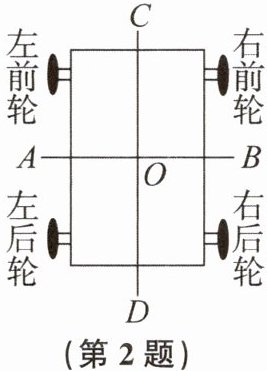 2. 有一辆小车载人后停在水平放置的地磅上时,左前轮、右前轮、左后轮、右后轮对地磅的压力分别为$50N$、$100N$、$60N$、$120N$。假设该小车四个轮子的轴心围成一个长方形,$O$为几何中心,$AB$、$CD$为两条对称轴,如图所示。若再在车上放一重物,能使整辆车所受重力的作用线通过$O$点,则该重物的重心应落在(