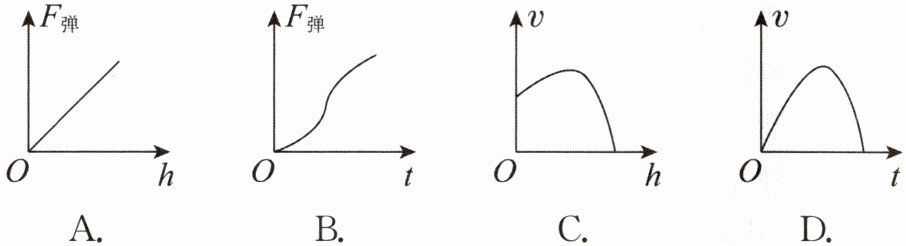 3. 如图所示,一小球从空中由静止下落到竖直放置的轻质弹簧上,弹簧所受弹力的大小与弹簧形变长度成正比。下列描述小球从刚接触弹簧到运动到最低点的过程中,小球受到弹簧的弹力$F_{弹}$、速度$v随离地高度h或时间t$变化的图像中,可能正确的是(
