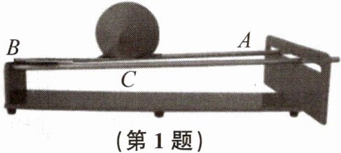1. 如图所示,$AB$是一个略向左下倾斜的轨道,轨道由两根小木棒组成,两根小木棒在$A$端的间距大,在$B$端的间距小。若将一个两头尖、中间大的滚动体由$C$处自由释放,则我们可以观察到的现象是(