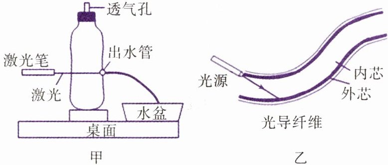 光纤(光导纤维)是一种由玻璃或塑料制成的纤维,可作为光传导工具。我们可以用光在水流中的传播模拟光纤技术,如图所示,在塑料瓶壁上开个小孔(接出水管),用激光笔对准小孔照射,打开瓶盖上的透气孔,让水从出水管流出来,激光笔发出的光顺着水流拐弯,不再沿着直线照射到对面。请回答下列问题: