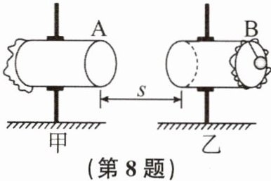 8. (2023春·金华市东阳市期末)某兴趣小组的成员设计了如图所示的实验装置来探究“声音的产生和传播”。图中A、B是直径为10 cm的去底塑料筒,在每个筒的一侧用橡皮筋扎一块橡皮膜,再在B筒的橡皮膜外吊一个乒乓球,装置固定在两张桌面上。