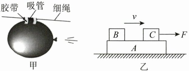(填“喷出的气体”或“球外空气”)。(2)如图乙所示,三个物块A、B、C叠放在水平桌面上,水平拉力F作用于C物块,使A、B、C以相同速度做匀速直线运动。此时桌面对A的摩擦力