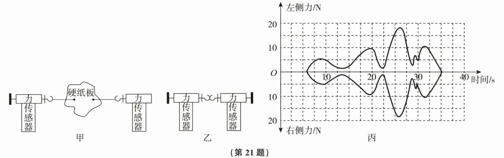 21. 某小组的同学们准备研究两个物体间相互作用力的特点。如图甲、乙所示为他们设计的两种实验方案,如图丙所示为他们按其中一种方案实验时得到的数据。