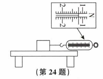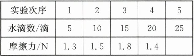 24. 小柯看见农民伯伯在用铁锹挖土时,不时地往手上吐口水,询问后得知是为了防止打滑,但为什么许多场合写着“地板湿滑,小心慢走”?于是他找来弹簧测力计、滴管、木块和一杯水进行探究。如图所示,在水平桌面上滴不同滴数的水并涂匀,立即让木块在桌面上做匀速直线运动,测出摩擦力,记录数据如表所示: