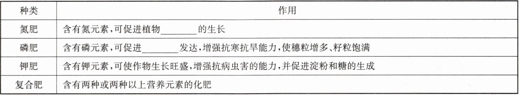 )注意点 草木灰(主要成分是碳酸钾)会与铵态氮肥反应生成二氧化碳与氨气,从而降低肥效。