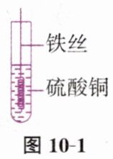 (1)铁和铜的活动性比较:在盛有硫酸铜溶液的试管里浸入一段洁净的(经过除油、除锈处理)铁丝,过一会儿取出,如图10-1所示。