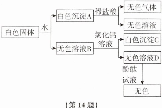 14. 有一包白色固体,可能由$BaCl_{2}$、NaOH、$Na_{2}CO_{3}$、$Na_{2}SO_{4}$中的一种或几种组成。为确定其成分,实验小组的同学们进行了实验。实验过程中所加试剂均足量,实验过程及现象如图所示。