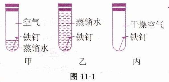如图11-1所示,分别将普通铁钉放置于有水有空气、有水没空气、干燥有空气的三支试管中进行对照实验。过一周后观察实验现象。