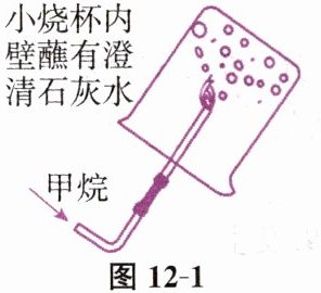 点燃甲烷气体,在火焰上方罩一个内壁蘸有澄清石灰水的烧杯,如图12-1所示。