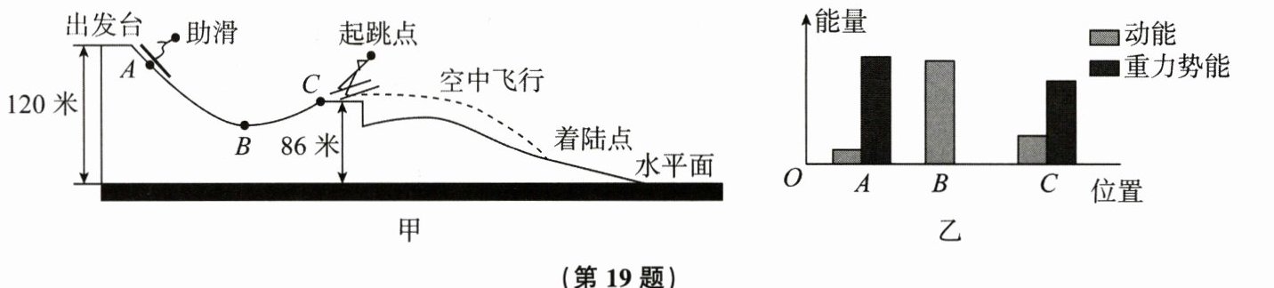 19. 如图甲所示,自由式滑雪比赛中,运动员从100米以上的出发台通过助滑加速至起跳点,依靠惯性跃向空中,做出一套空中动作后落地。