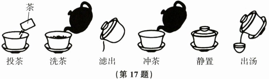 17. 茶作为中国的传统饮品,历史悠久,泡茶过程如图所示。茶汤中富含茶多酚,茶多酚是一种白色粉末,易溶于热水、乙醇等,在碱性环境中不稳定。