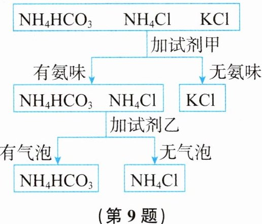 9. 如图所示为某同学鉴别$ {NH_{4}HCO_{3}} $、$ {NH_{4}Cl} $、$ {KCl} $三种化肥的过程,其中试剂甲和乙分别可能是(