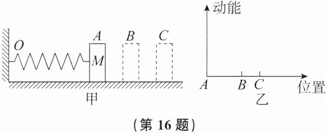16. 如图甲所示,一轻质弹簧的一端系在墙上的O点,自由伸长到B点,现将一小物块M连在弹簧上,并把弹簧压缩到A点,然后由静止释放,小物块能运动到C点静止,小物块与水平地面间的摩擦力大小恒定。在图乙中画出小物块运动过程中动能变化的大致曲线,并结合图像分析各过程能量的转化。