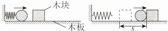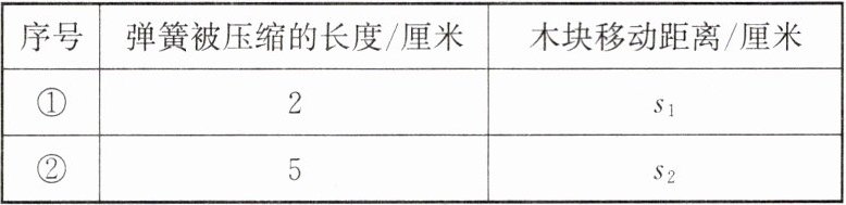 (填“>”或“<”)$s_{2}$,则说明弹性形变的程度越大,弹性势能就越大。(4)小科换用不同规格的弹簧做实验时,发现木块被撞出木板,影响木块移动距离的测量。在不改变木板长度的条件下,提出一条改进建议: