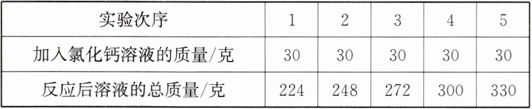 (2)为测定该草木灰浸出液中$K_2CO_3$的含量,做了如下实验:取浸出液200克加入烧杯,再将150克氯化钙溶液分五次加入,充分反应后,测得的实验数据如表所示。