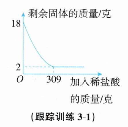 跟踪训练3-1 已知赤铁矿石的主要成分为氧化铁。某课外兴趣小组的同学将18克赤铁矿石样品(杂质既不溶于水,也不参加反应)放入烧杯中,并不断加入稀盐酸,烧杯中固体的质量随加入稀盐酸的质量变化情况如图所示。