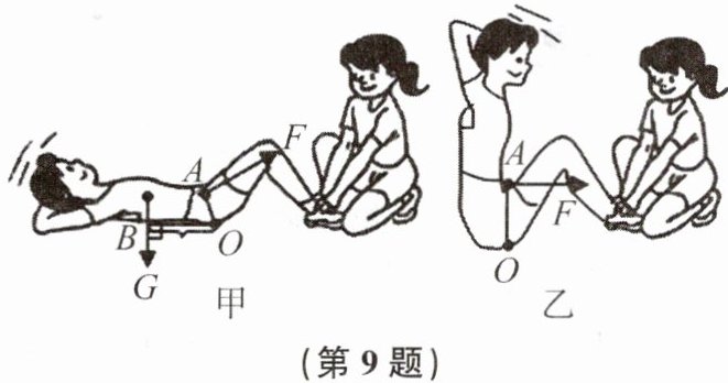9. (2024秋·台州市路桥区期末改编)仰卧起坐是一种锻炼身体的方式,但双臂抱头用力会对颈椎健康有潜在风险。正确姿势是双臂抱头不用力,靠腹部用力。练习时,上半身平躺的人体可以看成杠杆模型,如图甲所示,O为支点,腹部肌肉的拉力F为动力,上半身的重力G可视为阻力,大小为300牛,OA为动力臂,长为30厘米,OB为阻力臂,长为50厘米。