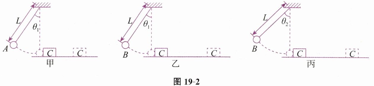 2. 利用如图19-2所示的装置探究“物体的动能大小与哪些因素有关”。将小球 $ A $、$ B $ 分别拉到与竖直方向成一定角度 $ \theta $ 的位置,然后都由静止释放,当小球摆动到竖直位置时,将与静止在水平面上的木块 $ C $ 发生碰撞,木块都会在水平面上滑行一定距离后停止。
