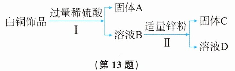 13. 白铜(Cu-Ni合金)因光泽好、耐腐蚀、容易加工等优点,常代替银用来制作饰品。如图所示为某实验室分离废弃白铜饰品成分的流程。(部分反应产物在图中已略去)
