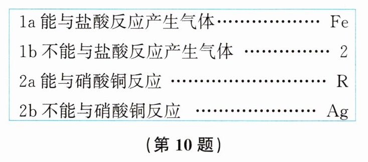 10. 小科通过实验探究某种金属R的活动性强弱,并根据实验现象编制检索表如图所示,根据检索表可知,金属R的活动性强弱排序正确的是(