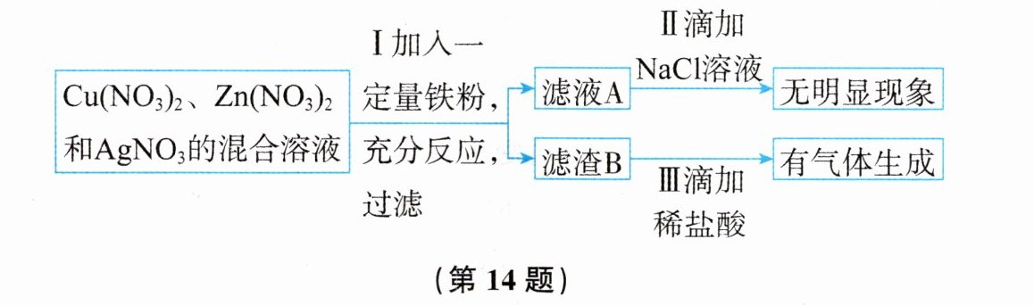 14. 我国古代就有湿法冶金技术,湿法冶金是利用置换反应从盐溶液中制得金属。在实验室中,把一定量的铁粉加入一定量的$Cu(NO_{3})_{2}$、$Zn(NO_{3})_{2}和AgNO_{3}$的混合溶液中,进行实验,流程如图所示。
