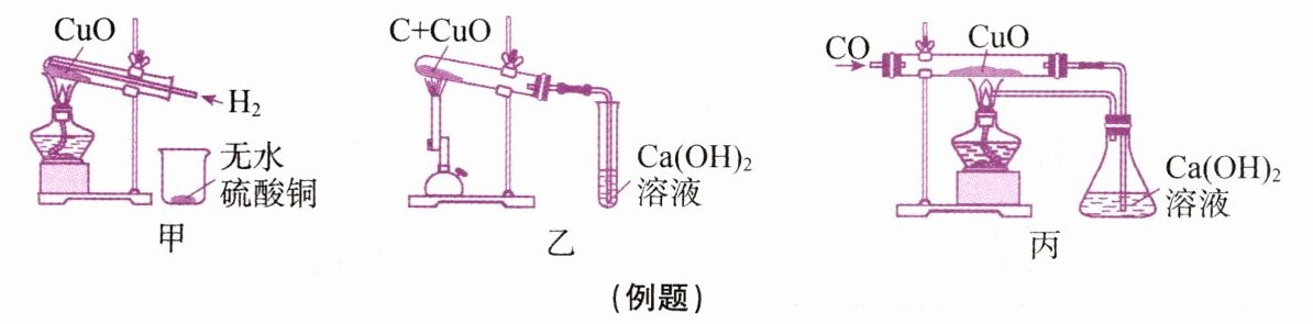 【例题】用如图所示的装置进行{H_{2}}、C、CO还原CuO的实验并检验产物(已知:白色粉末是无水硫酸铜,遇水会变为蓝色)。